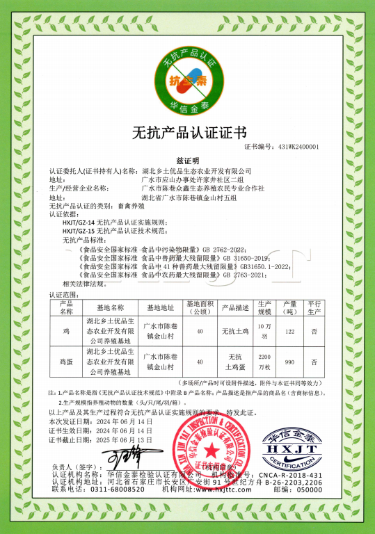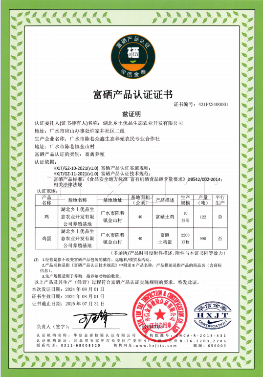 乡土优品最引以为傲的特色是产品富含硒元素。硒是人体必需的微量元素,具有抗氧化、增强免疫力、延缓衰老等多种保健功能。公司特别研发的"硒肽鸡、硒肽蛋",通过科学的饲养方式和特殊富硒技术,使产品中富含有机硒。这一核心技术已获得硒肽鸡标准认证,是全国独一无二的富硒养殖模式。2024年,公司产品先后获得有机产品认证证书、富硒产品认证证书和无抗产品认证证书,科学证明了产品的优良品质和安全性。消费者在享用美味的同时,还能获得更多健康元素,实现了"食品"与"保健"的双重功效。