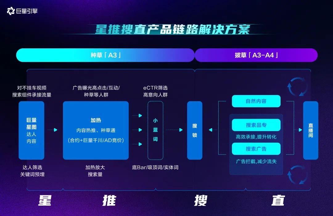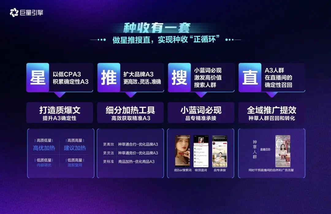 「星推搜直」以A3人群为轴心,通过星图、热推、搜索、直播,四大产品全新组合,构成了提升种收确定性的营销链路,大大降低种草成本。