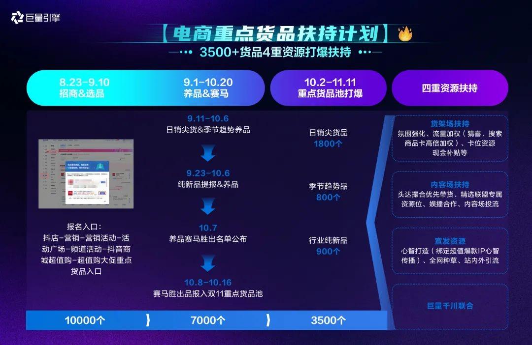 在今年的双11大促中,巨量引擎主张针对不同的货品进行分层运营:商家可以根据自己商品的属性对应选择合适的权益体系,此次针对货品,抖音电商重点推出货品扶持计划,通过赛马制,从10000个品中优选出3500个,给到重磅四重资源扶持,为重点商品保驾护航。