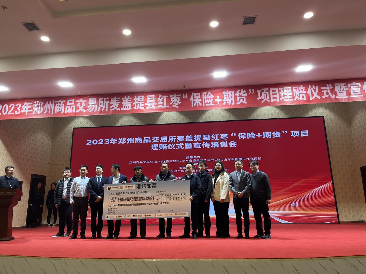 2024年3月5日,招商期货有限公司(以下简称招商期货)参与的2023年新疆麦盖提县红枣“保险+期货”项目理赔仪式暨宣传培训会圆满举行。