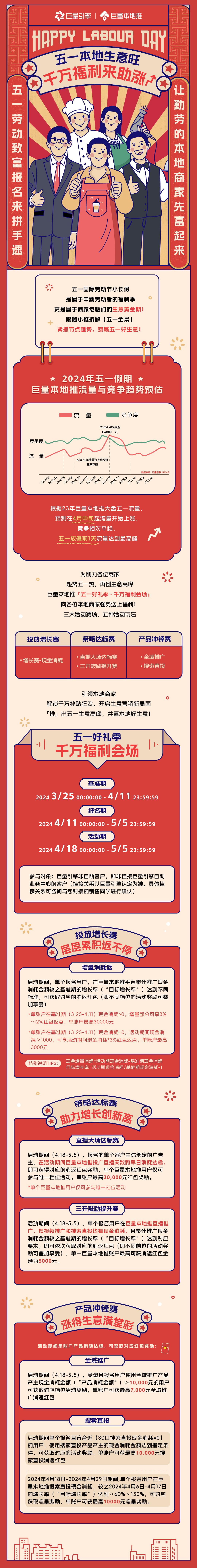 据巨量本地推大数据分析显示,基于2023年五一期间的流量表现,预计2024年五一假期流量将从4月中旬开始稳步上涨,竞争相对平稳,而五一放假前一天将迎来流量最高峰。巨量本地推抢抓节点趋势,自2024年4月18日-2024年5月5日,特别推出“五一好礼季·千万福利会场”大促活动,旨在助力本地商家把握五一商机,再创生意高峰。