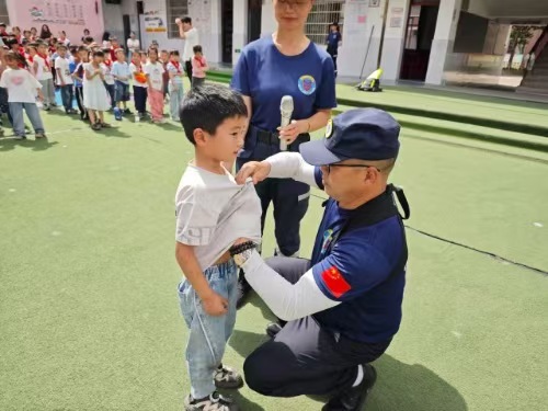 活动伊始,救援队姜队长通过讲解一个个触目惊心的实际案例,强调了自救技能在危急时刻的关键作用,希望通过此次活动,让安全意识真正融入师生的日常。在教学环节中,姜队长化身“安全导师”,生动演示了多项实用技能:他指导学生如何利用空矿泉水瓶等常见物品进行自救,手把手教学救生衣的正确选择与穿戴方法,还系统讲解了防溺水的基本自护知识——从“远离危险水域”的预防意识,到“溺水时保持冷静、呼救与自救结合”的应对策略,每一个细节都深入浅出、干货十足。学生们在互动中深刻掌握了生存技能,更对“生命安全”有了直观而深刻的认识。
