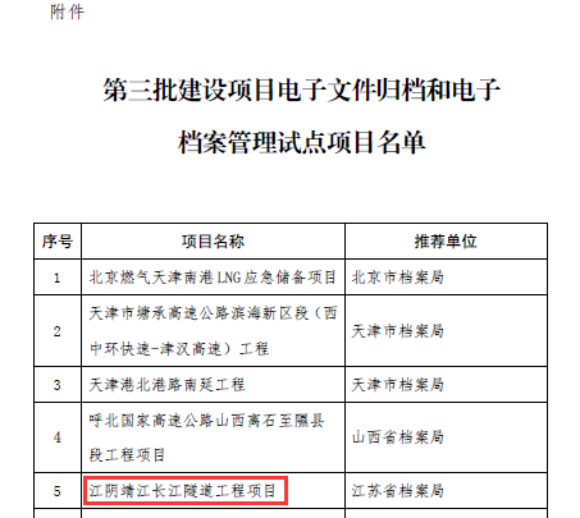 今年3月份,孜博汇“纸云同步”助力江阴靖江长江隧道工程从全国84个试点申报项目中脱颖而出,获批《国家档案局第三批建设项目电子文件归档和电子档案管理试点项目》。