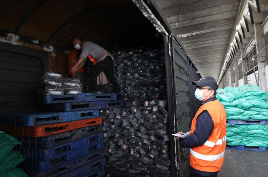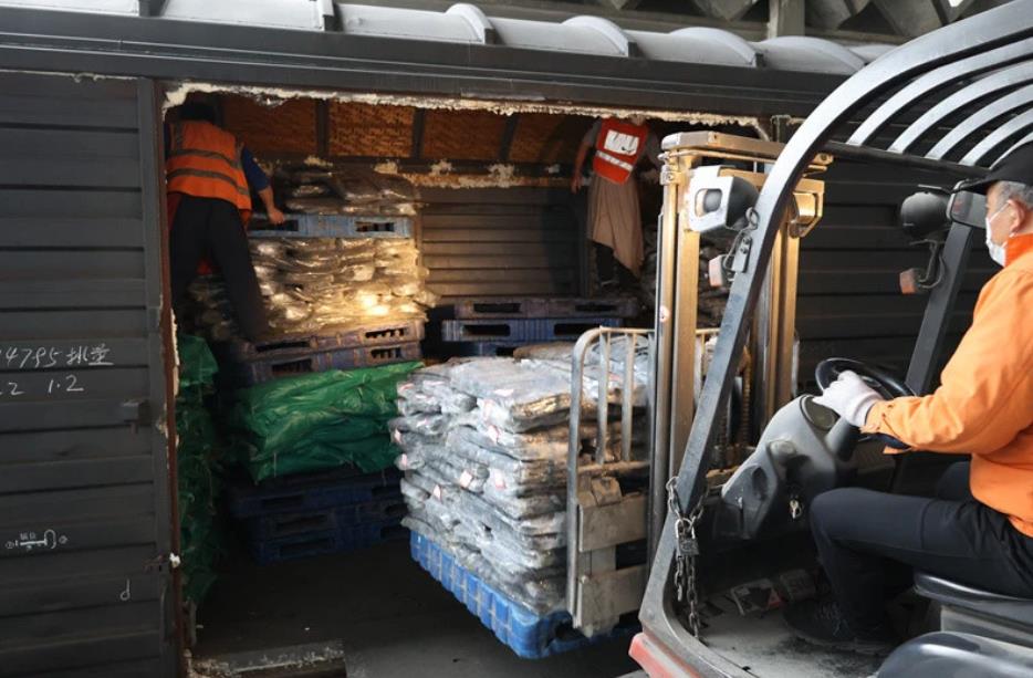 中国铁路南昌局集团有限公司福州车务段福州东站装卸工正在对海带进行装车。 王勇富 摄