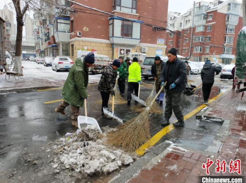 长春市二道区东惠街道的工作人员们正在清扫背街小巷的雨雪。谭伟旗摄