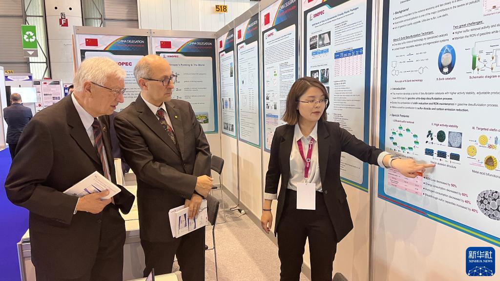 4月29日,在瑞士日内瓦举行的第48届日内瓦国际发明展上,金奖项目“S Zorb汽油吸附脱硫技术”发明团队代表宋烨(右一)向参观者介绍发明项目(手机照片)。新华社发(受访者供图)