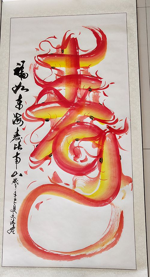 高文清出生在一个书香之家,其祖书画兼能,并综合书与画的共同特点,发展出“鱼书”。所谓“鱼书”,是以鱼之形为笔画,构成字体,将书与画融为一体,形成了更加强烈的视觉冲击力。“鱼”在中华民族文化中的象征意义十分丰富,因“鱼”与“余”同音,所以鱼象征着富贵。民俗岁末祭祖中讲究供鱼,取年年有余之吉利,则是对鱼的一种图腾崇拜。“如鱼得水”“鱼水之乐”用来描述工作和生活和谐美满、幸福、自在。而在更高的精神层面,则象征着人的精神自由,人与自然的和谐相处。以鱼的图形为笔画构成“福”“寿”等字,使其字的内涵更加丰富,富贵吉祥的气息更为直观,扑面而来,给人的艺术感受更加深邃浓郁,回味无穷。