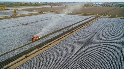 2024年在沙雅县塔里木乡高标准农田里采棉机来回穿梭采收棉花。程磊摄