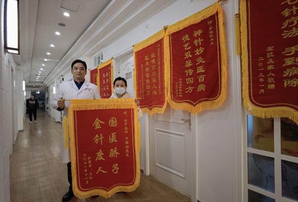 走进乌鲁木齐青年路社区卫生服务中心三楼,在前往中医治疗科室的走廊里,一面面鲜红的锦旗耀眼夺目,“妙手神针”“悬壶济世”“仁心救人”“妙手回春”等等赞誉跃然旗面,从落款上可以看出,它们是来自不同城市的不同人,赠送和感谢的却是同一个人,那就是该卫生服务中心中医罗雄征主任。