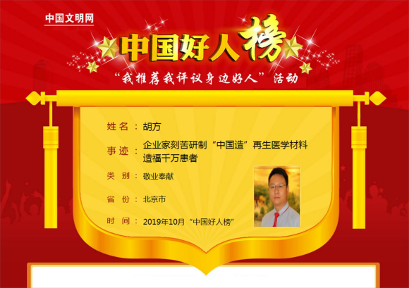 关于胡方得奖一事,业内不少前辈点评,此乃实至名归,同时他们还强调,再生医学产业呼吁更多的“胡方”加入,他够专业,有大爱,他能用更先进的技术创新塑造行业标准,他能真真正正将前沿技术、机械用到那些最有需要的人身上,充分释放出产品的价值。