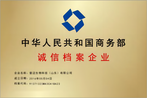 经过登迈集团公司不懈努力荣获AAA企业标准,国家质量监督合格红榜产品,中国著名品牌,315诚信经营合法守信企业,中国农业一级资质,发明专利,全国城市工业品联合会信用认证企业,入围美国纽约纳斯达克大屏展播品牌,此次登迈生物科技(山东)有限公司经层层审核成功顺利入选国家级商务部诚信档案企业,荣誉不仅是对登迈生物长期以来规范管理,诚实守诺的高度认可和肯定更是登迈人诚信经营的承诺和强大履约能力的有力证明。